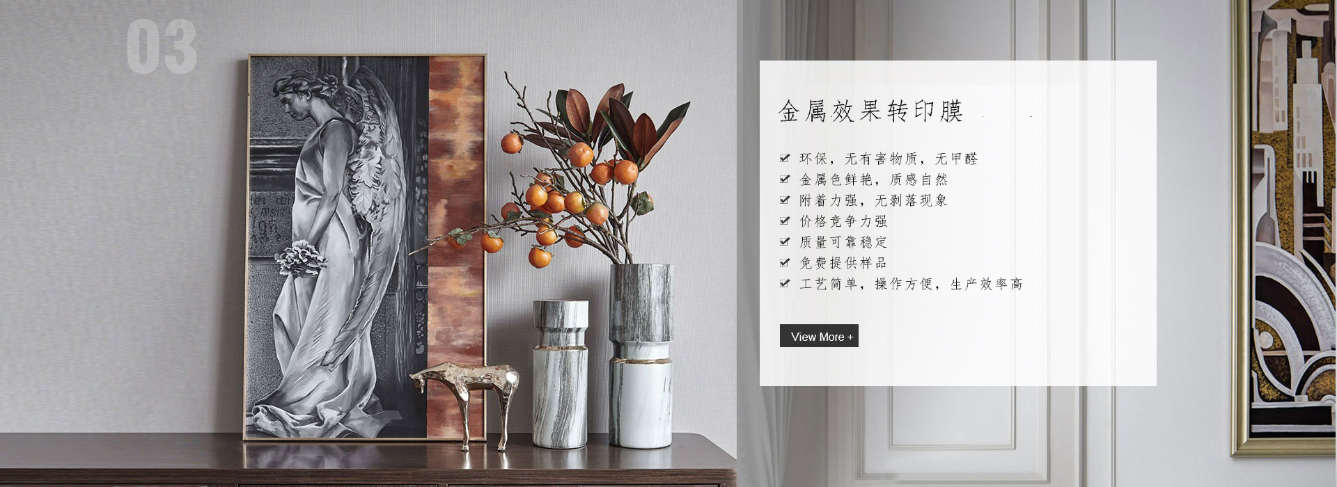 主要用于塑料異型板表面仿金屬裝飾。產品包括金屬框架、ABS塑料板等。